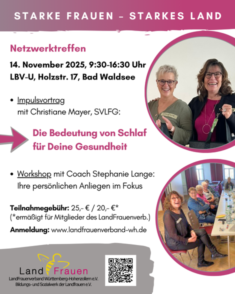 Am Vormittag des Netzwerktreffens steht das Thema Schlaf im Mittelpunkt. Christiane Mayer von der SVLFG erläutert in ihrem Impulsvortrag nicht nur, warum Schlaf so entscheidend für unser Wohlbefinden ist, sondern nennt auch praktische Tipps und alltagstaugliche Strategien, mit denen Sie Ihre Schlafqualität verbessern und stressbedingten Beschwerden vorbeugen können.