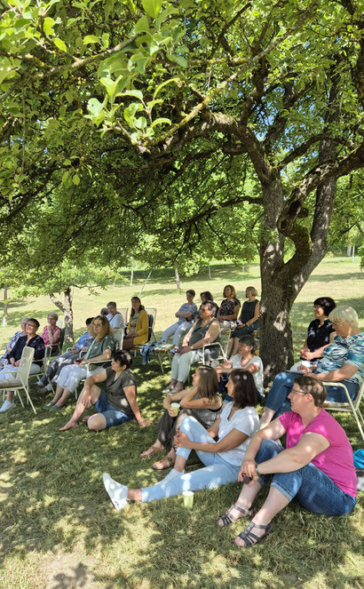 Im idyllischen Streuobstgarten mit Seerosenteich wurde nicht nur gelacht und posiert, sondern auch viel ausprobiert. Zwei professionelle Fotografinnen Petra Haussmann und Tina Kräutle führten die Teilnehmerinnen in die Kunst des guten Handyfotos ein: Belichtung, Fokus, Kamera reinigen, Perspektive finden – lauter kleine Aha-Momente, die großen Effekt zeigten. Viele probierten gleich vor Ort aus, was sie gelernt hatten – mit sichtbarem Erfolg.